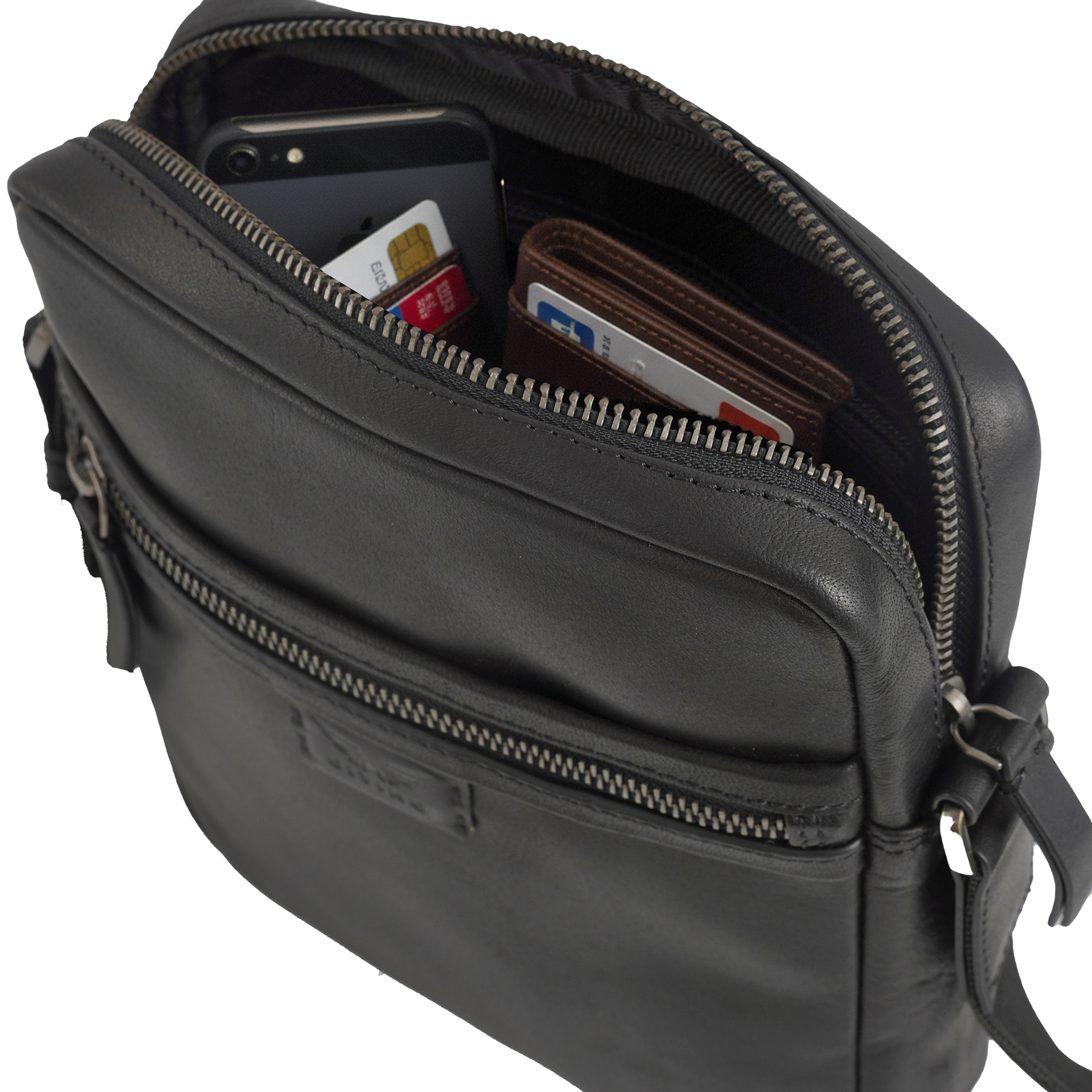 It includes zip pockets on both the front and back, plus an interior mobile pocket and essential storage space.