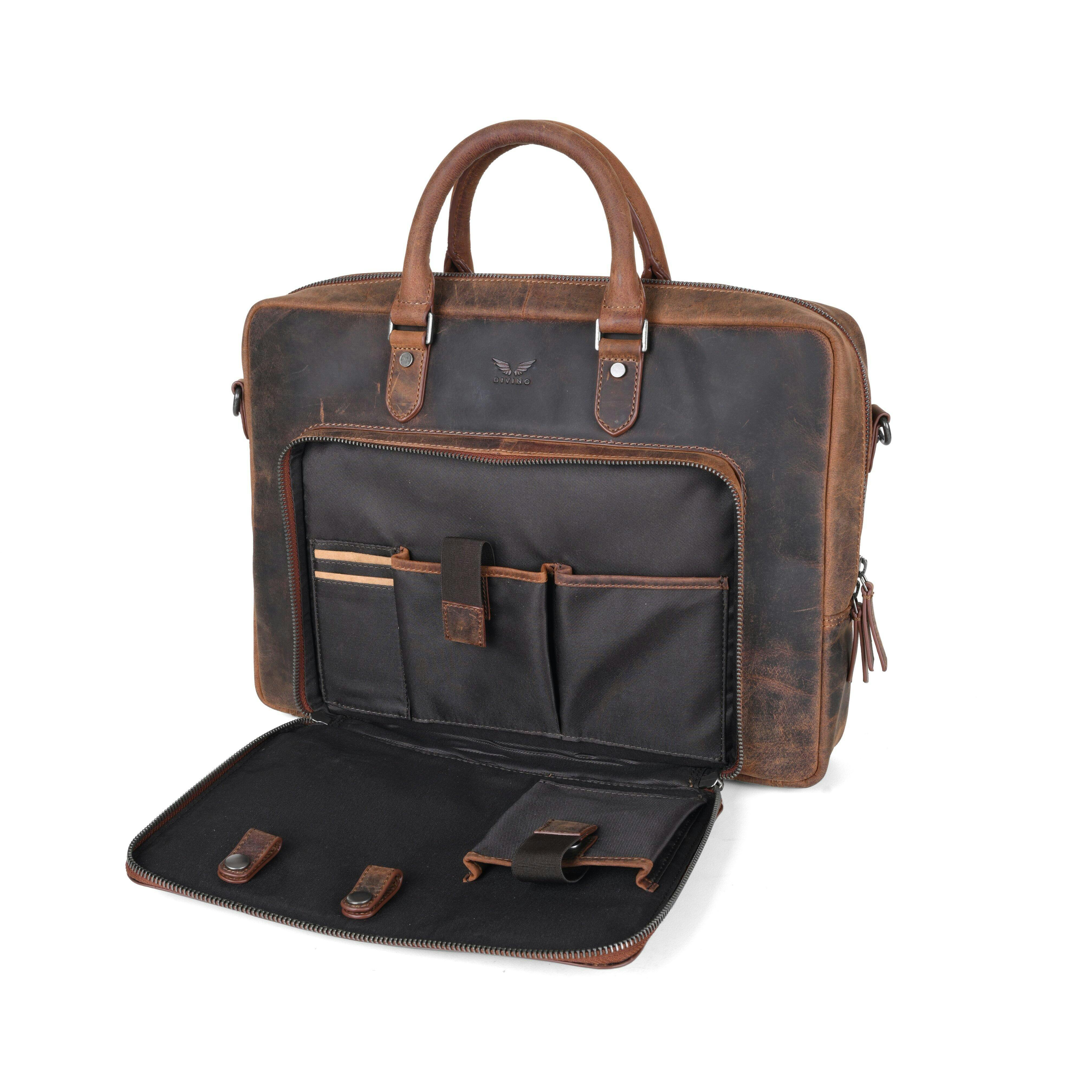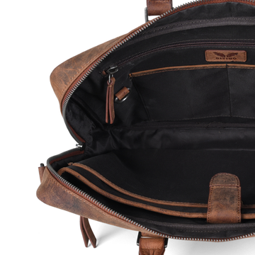 The briefcase comfortably fits laptops up to 16 inches, along with an iPad, thanks to its padded compartment with adjustable Velcro fastening.